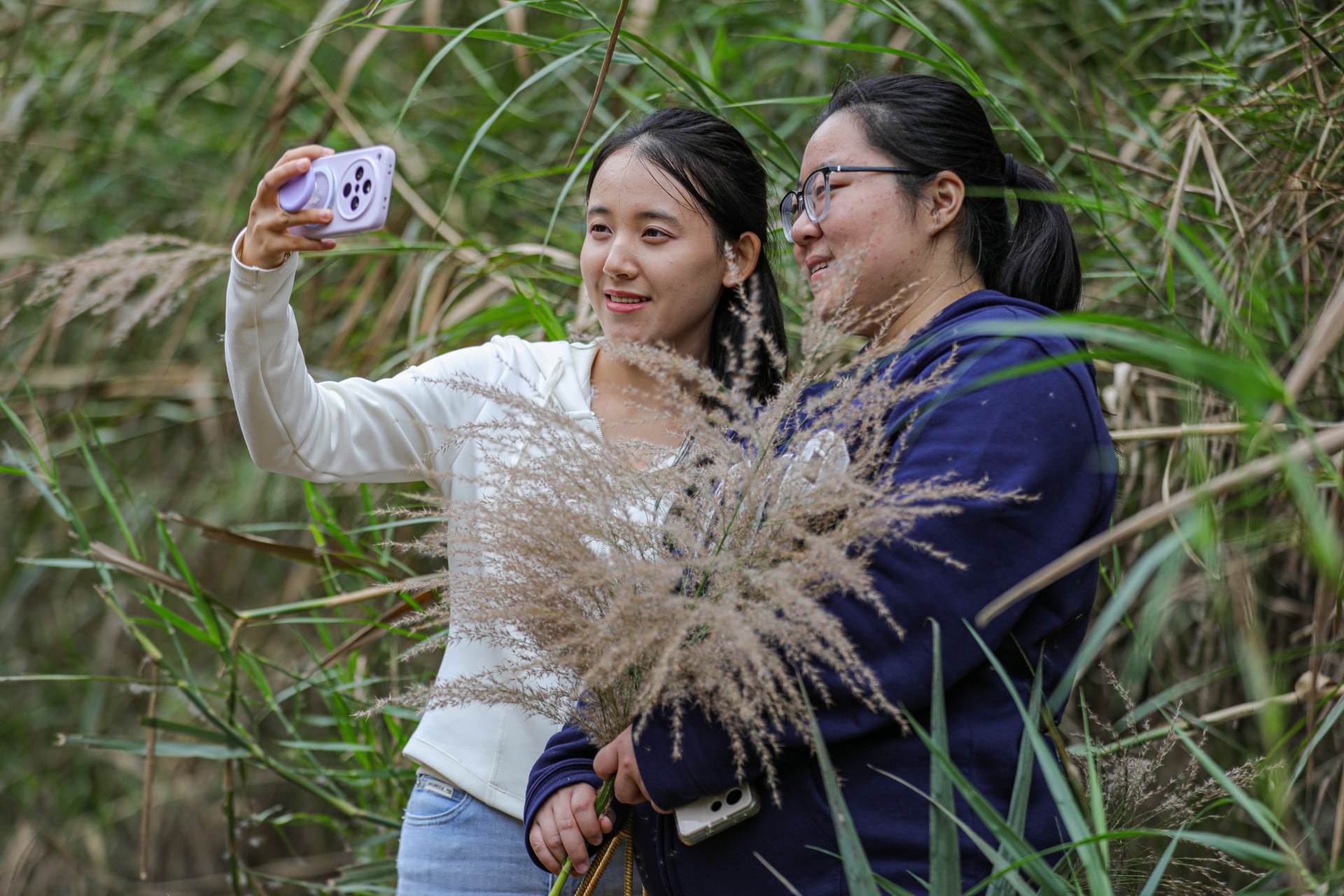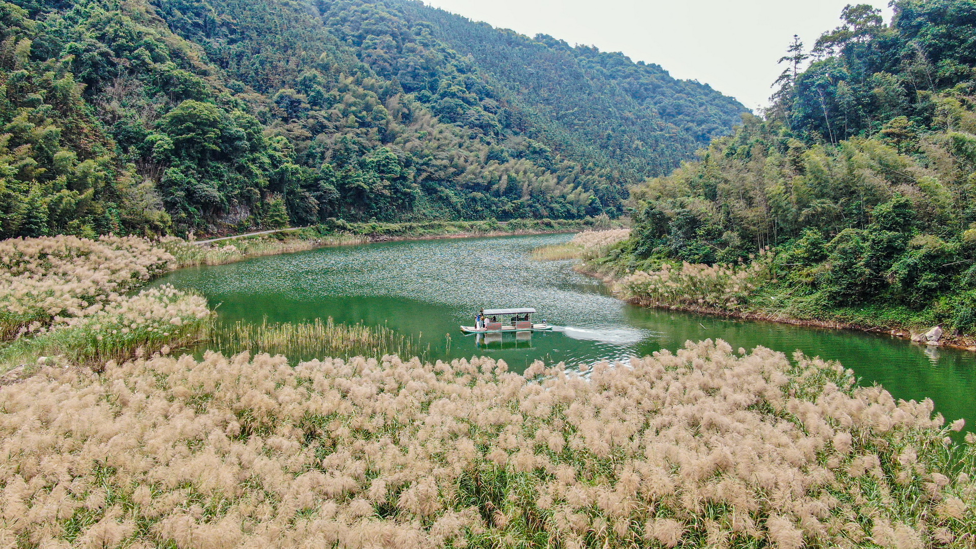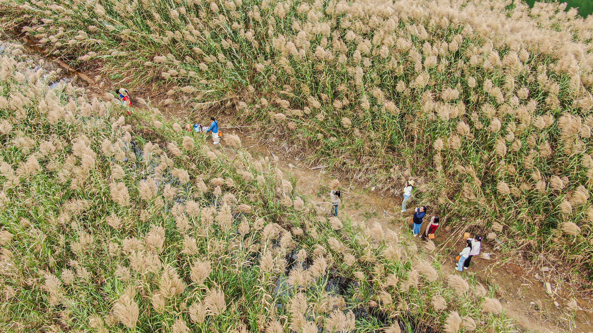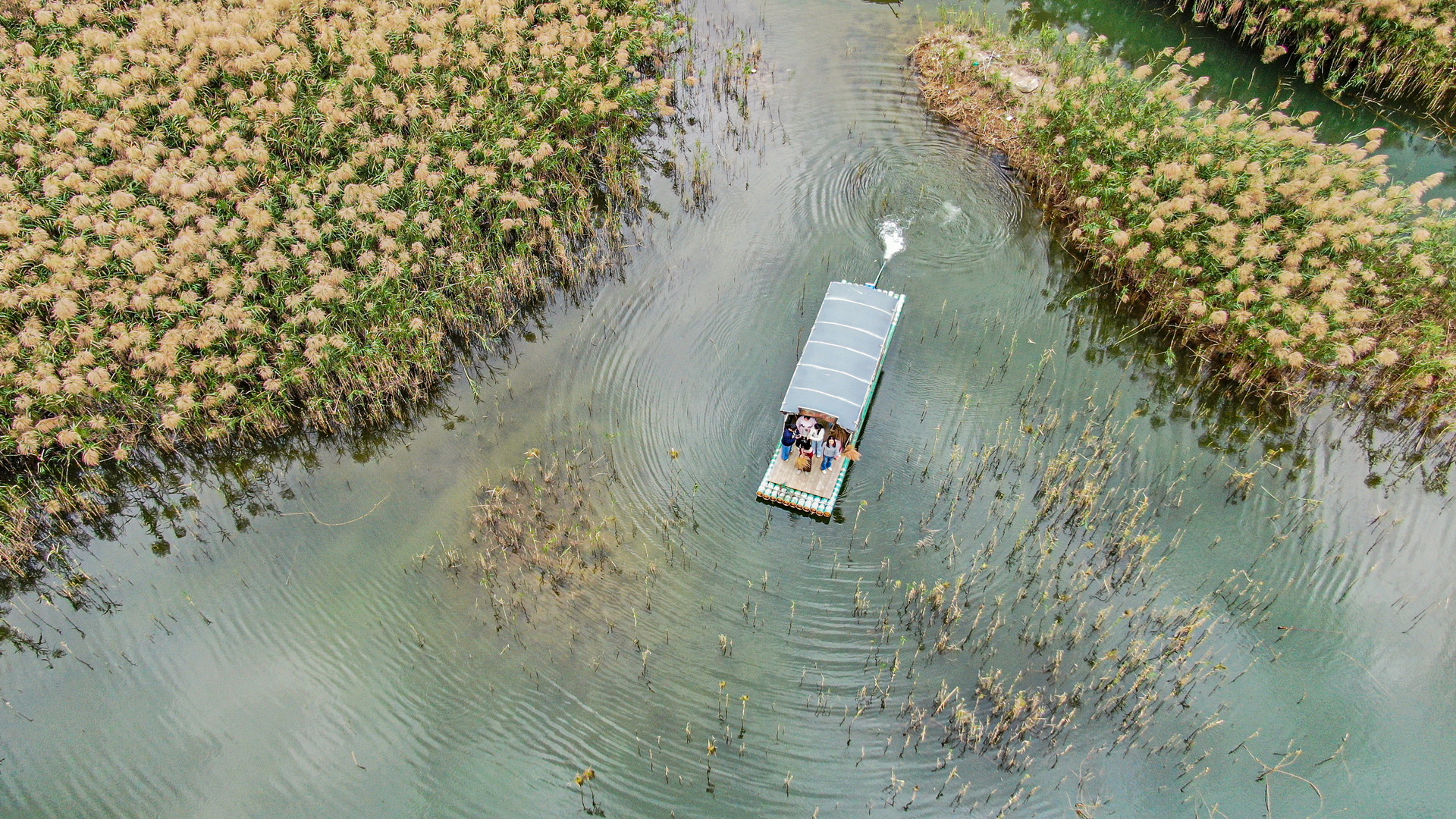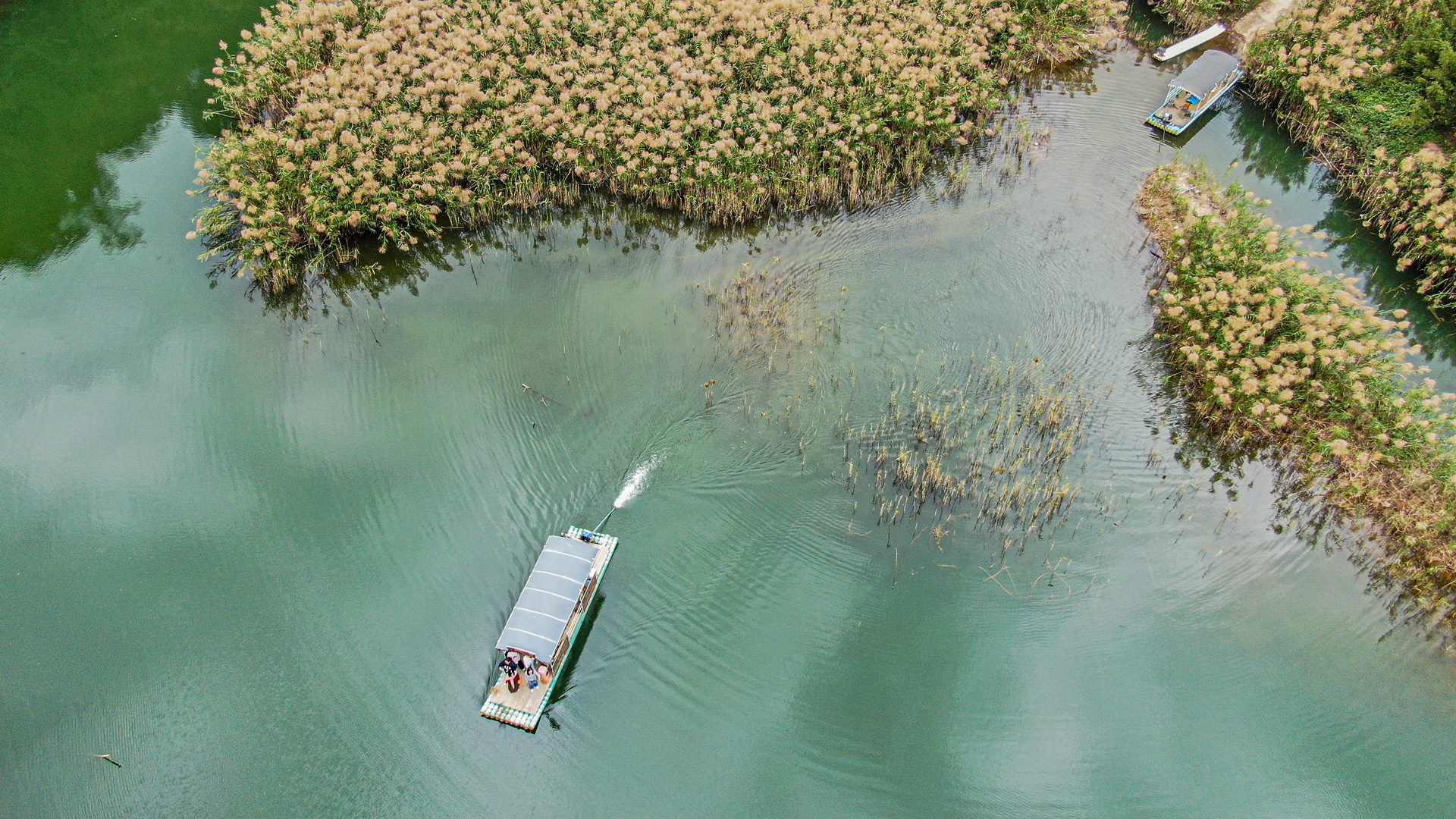 从空中俯瞰,盛放的芦花如波如浪,为大地铺上了一层梦幻的白色地毯,层层叠叠的芦苇连绵成片,蜿蜒的乡村小路和清澈的河流穿梭其间,与连绵的青山共同构成了一幅层次丰富的生态画卷。近看,一簇簇洁白的芦花在阳光下泛着柔和的光泽,随风轻盈舞动,沙沙作响。湖面上,游船悠然划破平静的水面,三两游客悠闲乘船,从另一种视角欣赏这片芦花胜景。两岸的苇浪如白色帷幕缓缓移过,舟行景移,带来"船在江上走,人在画中游"的独特体验。(来源:阳海翔)