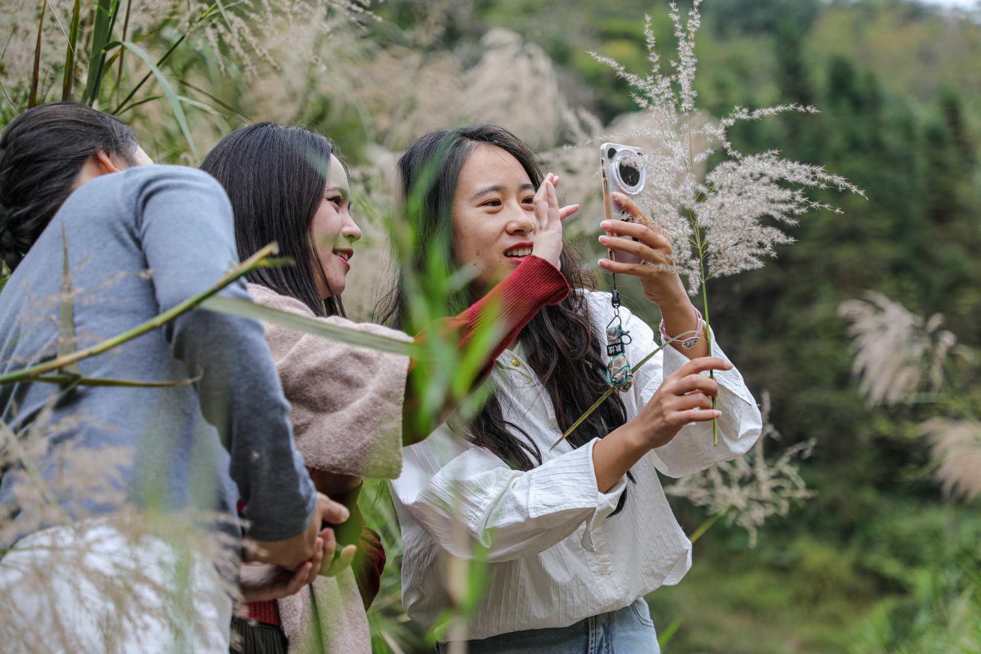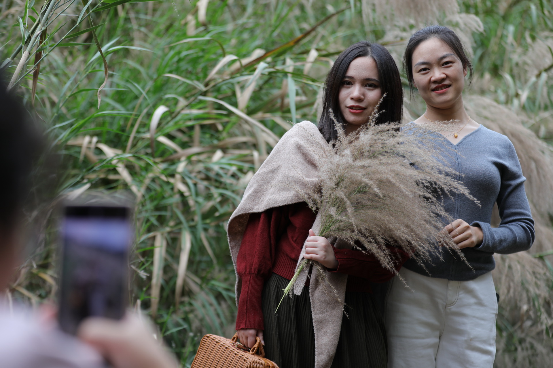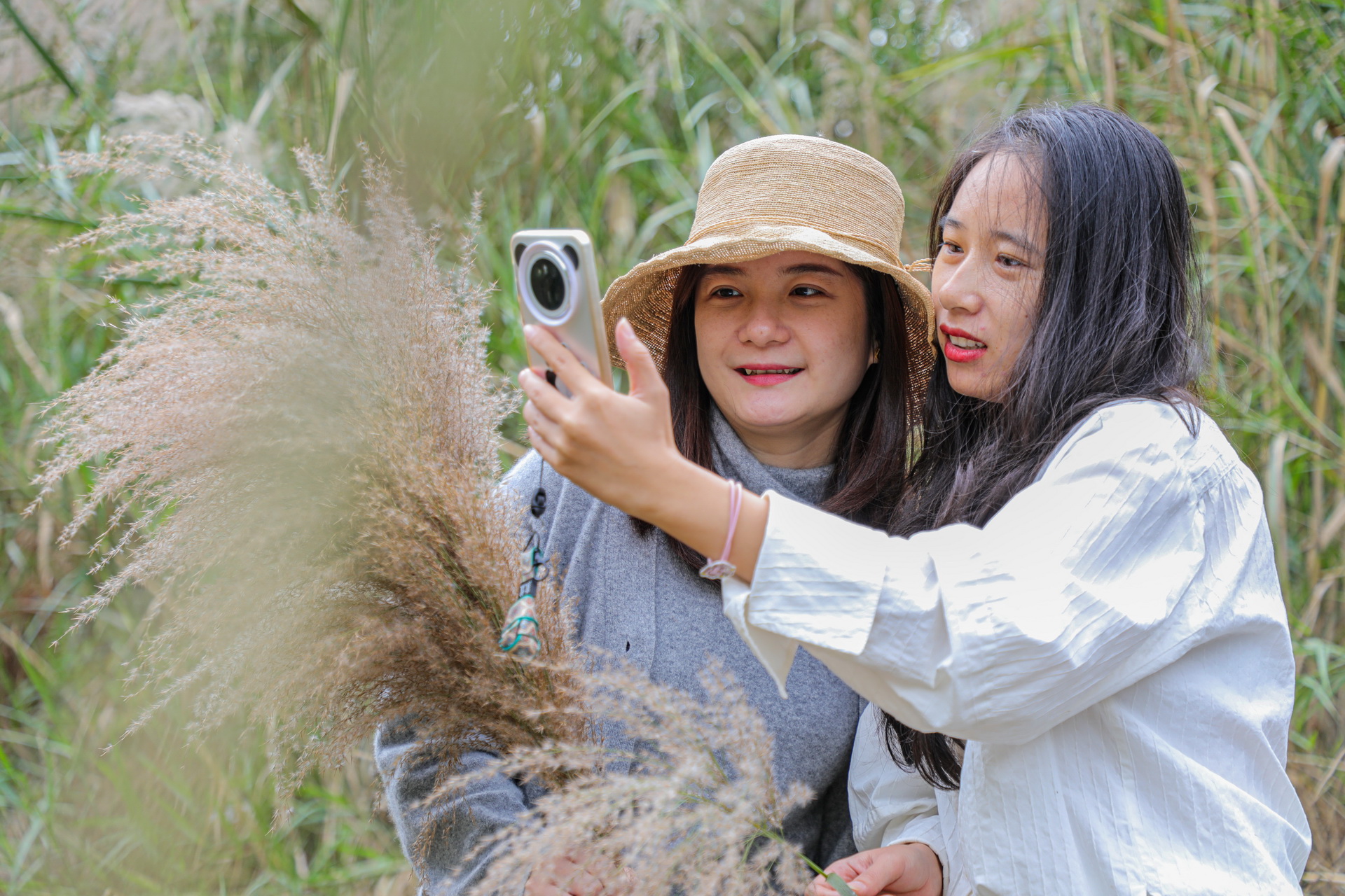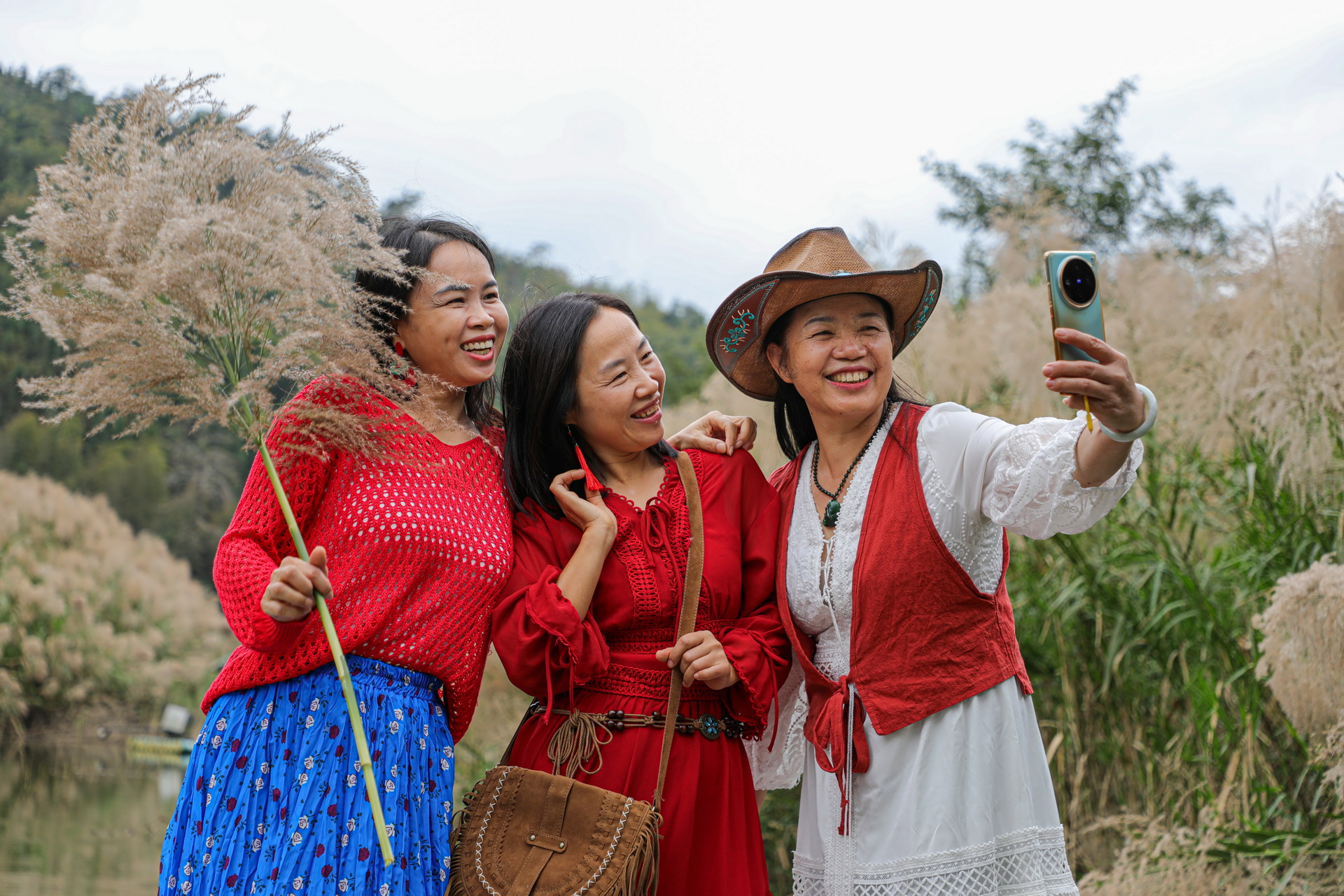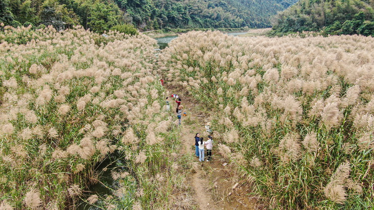 从空中俯瞰,盛放的芦花如波如浪,为大地铺上了一层梦幻的白色地毯,层层叠叠的芦苇连绵成片,蜿蜒的乡村小路和清澈的河流穿梭其间,与连绵的青山共同构成了一幅层次丰富的生态画卷。近看,一簇簇洁白的芦花在阳光下泛着柔和的光泽,随风轻盈舞动,沙沙作响。湖面上,游船悠然划破平静的水面,三两游客悠闲乘船,从另一种视角欣赏这片芦花胜景。两岸的苇浪如白色帷幕缓缓移过,舟行景移,带来"船在江上走,人在画中游"的独特体验。(来源:阳海翔)
